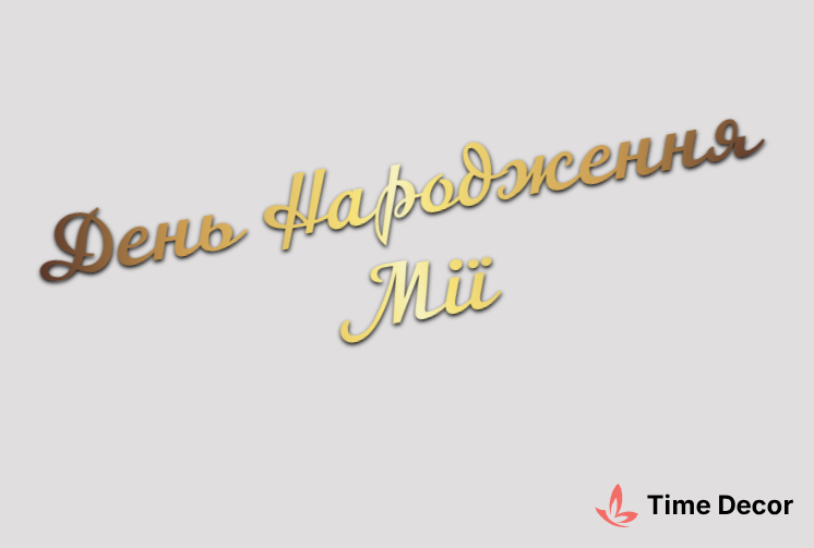 Пластиковий напис "День Народження Мії" – дзеркальний або матовий пластик, можливе виготовлення з клейкою зворотною поверхнею для легкого монтажу.