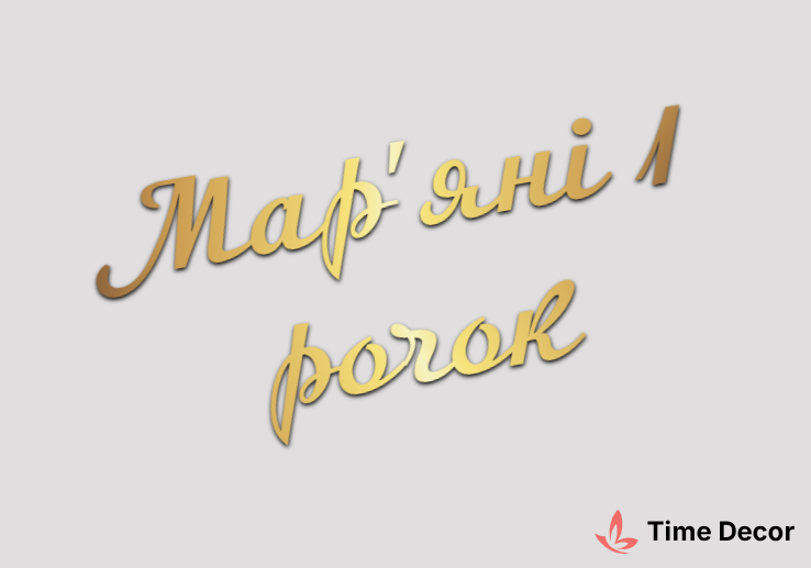 Пластиковий напис "Мар'яні 1 рочок" – дзеркальний або матовий пластик, можливе виготовлення з клейкою зворотною поверхнею для легкого монтажу.