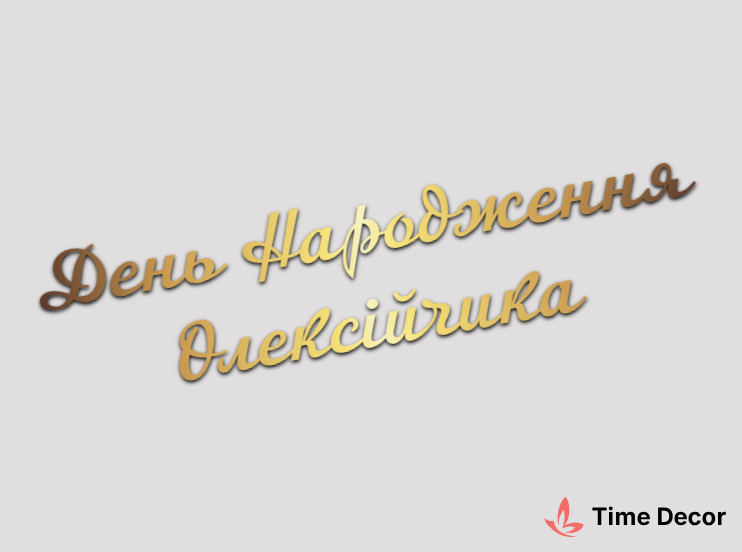 Пластиковий напис "День Народження Олексiйчика" – дзеркальний або матовий пластик, можливе виготовлення з клейкою зворотною поверхнею для легкого монтажу.