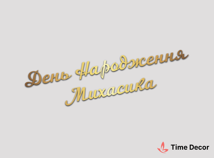 Пластиковий напис "День Народження Михасика" – дзеркальний або матовий пластик, можливе виготовлення з клейкою зворотною поверхнею для легкого монтажу.