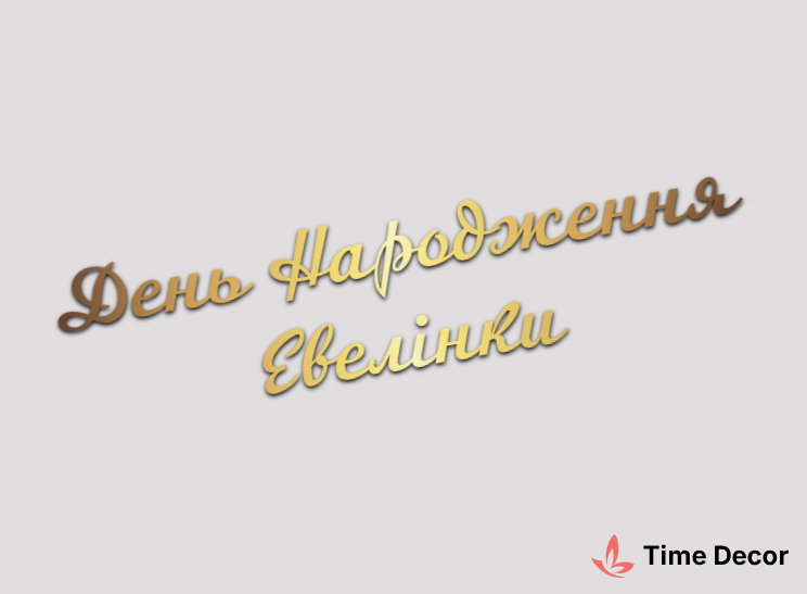 Пластиковий напис "День Народження Евелінки" – дзеркальний або матовий пластик, можливе виготовлення з клейкою зворотною поверхнею для легкого монтажу.