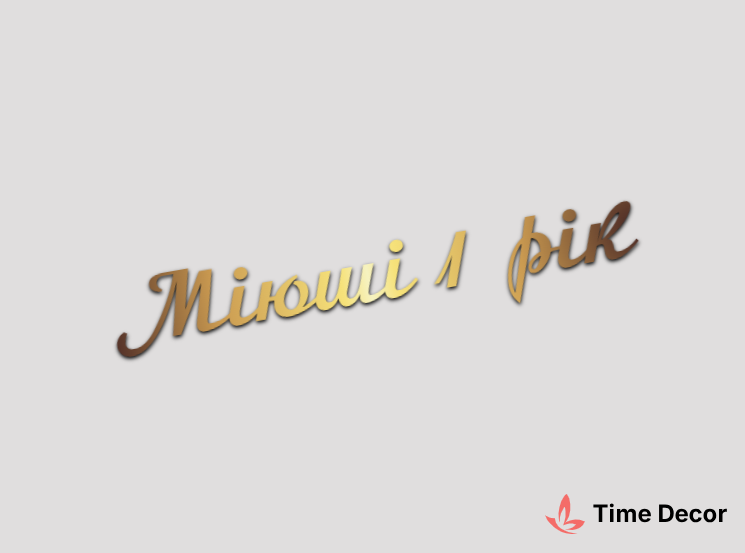 Пластиковий напис "Міюші 1 рік" – дзеркальний або матовий пластик, можливе виготовлення з клейкою зворотною поверхнею для легкого монтажу.