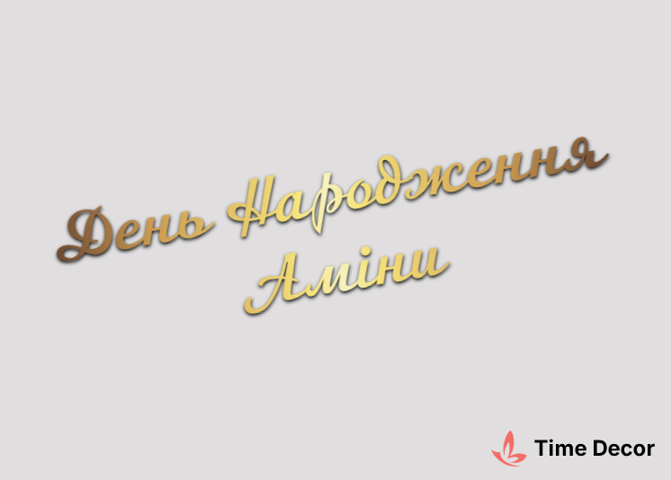 Пластиковий напис "День Народження Аміни" – дзеркальний або матовий пластик, можливе виготовлення з клейкою зворотною поверхнею для легкого монтажу.