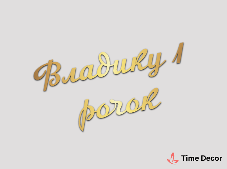 Пластиковий напис "Владику 1 рочок" – дзеркальний або матовий пластик, можливе виготовлення з клейкою зворотною поверхнею для легкого монтажу.
