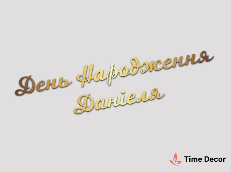 Пластиковий напис "День Народження Данiеля" – дзеркальний або матовий пластик, можливе виготовлення з клейкою зворотною поверхнею для легкого монтажу.