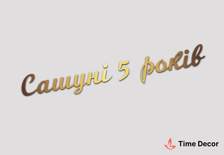 Пластиковий напис "Сашуні 5 років" – дзеркальний або матовий пластик, можливе виготовлення з клейкою зворотною поверхнею для легкого монтажу.
