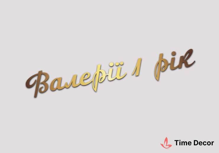 Пластиковий напис "Валерії 1 рік" – дзеркальний або матовий пластик, можливе виготовлення з клейкою зворотною поверхнею для легкого монтажу.
