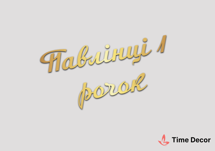 Пластиковий напис "Павлінці 1 рочок" – дзеркальний або матовий пластик, можливе виготовлення з клейкою зворотною поверхнею для легкого монтажу.