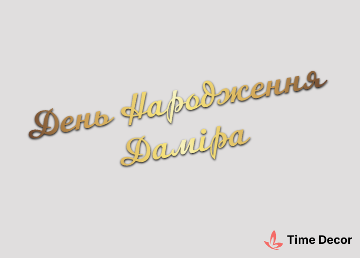 Пластиковий напис "День Народження Даміра" – дзеркальний або матовий пластик, можливе виготовлення з клейкою зворотною поверхнею для легкого монтажу.
