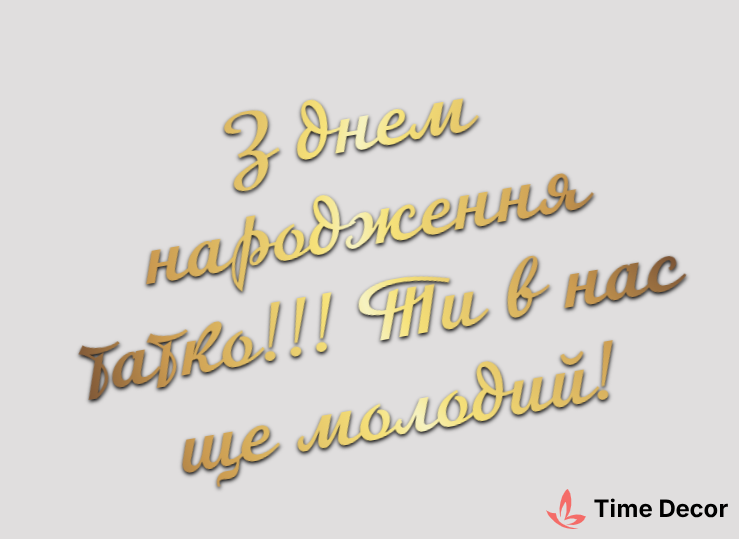 Пластиковий напис "З днем народження татко!!! Ти в нас ще молодий!" – дзеркальний або матовий пластик, можливе виготовлення з клейкою зворотною поверхнею для легкого монтажу.