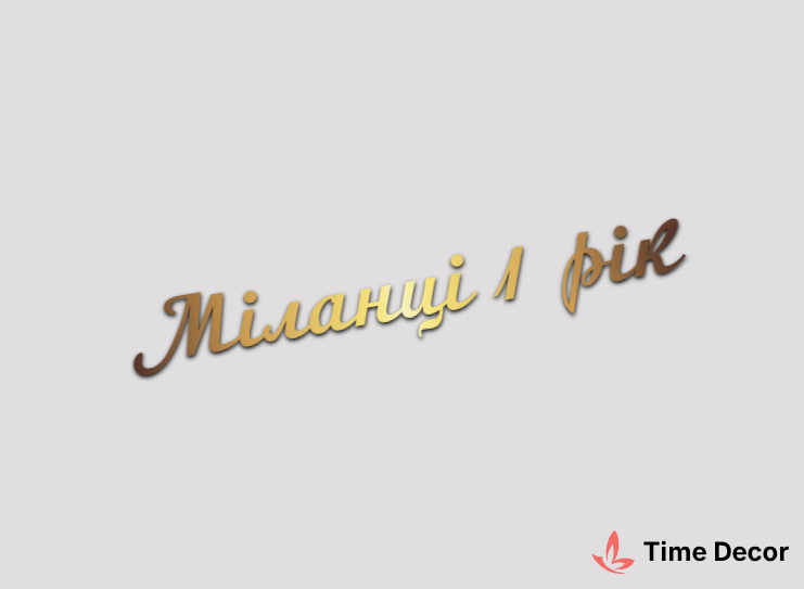 Пластиковий напис "Міланці 1 рік" – дзеркальний або матовий пластик, можливе виготовлення з клейкою зворотною поверхнею для легкого монтажу.