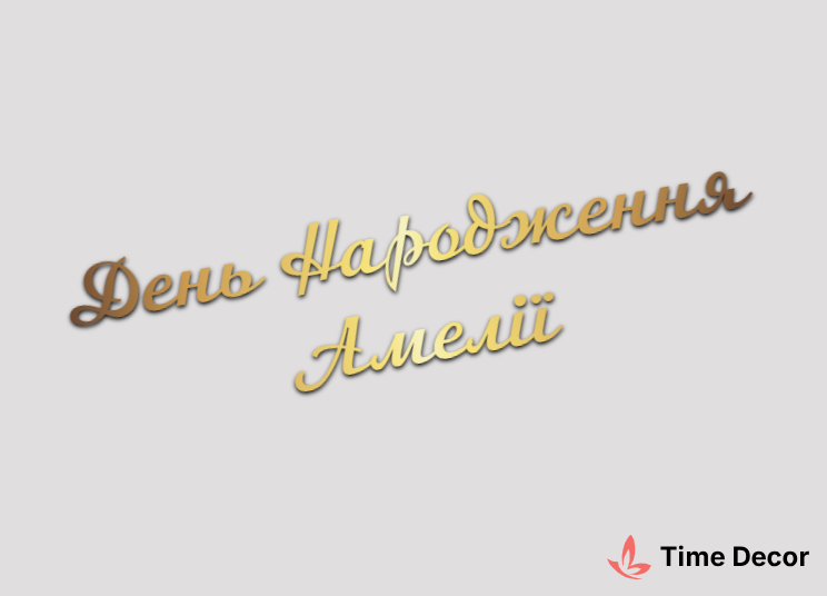 Пластиковий напис "День Народження Амелії" – дзеркальний або матовий пластик, можливе виготовлення з клейкою зворотною поверхнею для легкого монтажу.