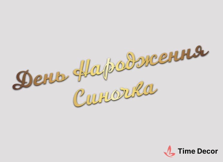 Пластиковий напис "День Народження Синочка" – дзеркальний або матовий пластик, можливе виготовлення з клейкою зворотною поверхнею для легкого монтажу.