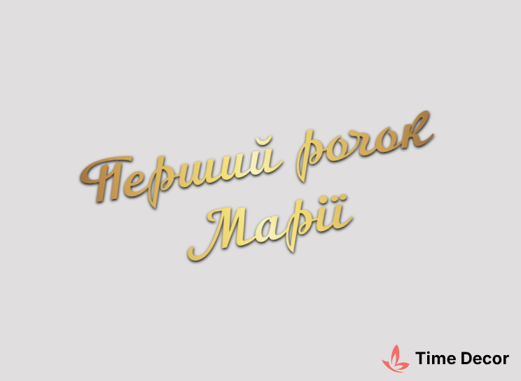Пластиковий напис "Перший рочок Марії" – дзеркальний або матовий пластик, можливе виготовлення з клейкою зворотною поверхнею для легкого монтажу.