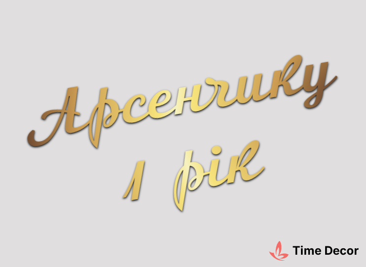 Пластиковий напис "Арсенчику 1 рік" – дзеркальний або матовий пластик, можливе виготовлення з клейкою зворотною поверхнею для легкого монтажу.