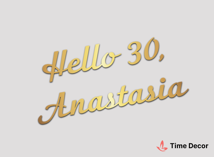 Пластиковий напис "Hello 30, Anastasia" – дзеркальний або матовий пластик, можливе виготовлення з клейкою зворотною поверхнею для легкого монтажу.