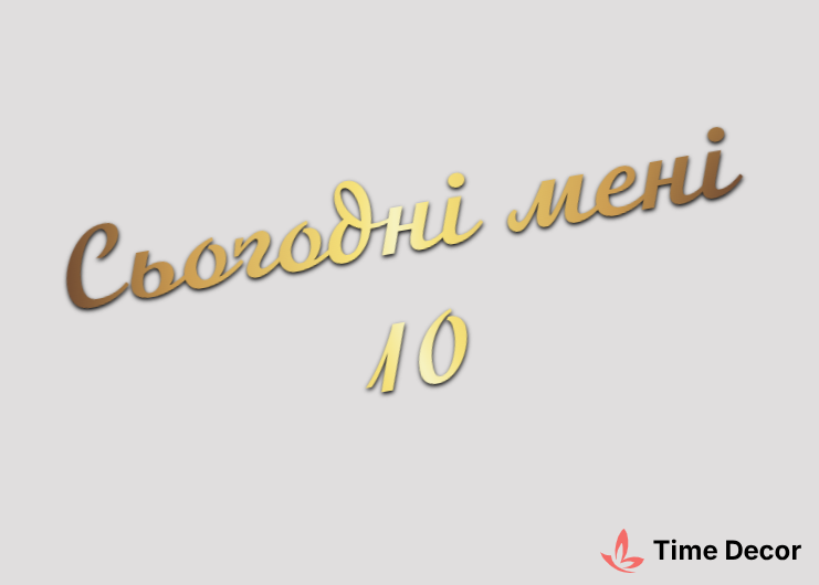 Пластиковий напис "Сьогодні мені 10" – дзеркальний або матовий пластик, можливе виготовлення з клейкою зворотною поверхнею для легкого монтажу.