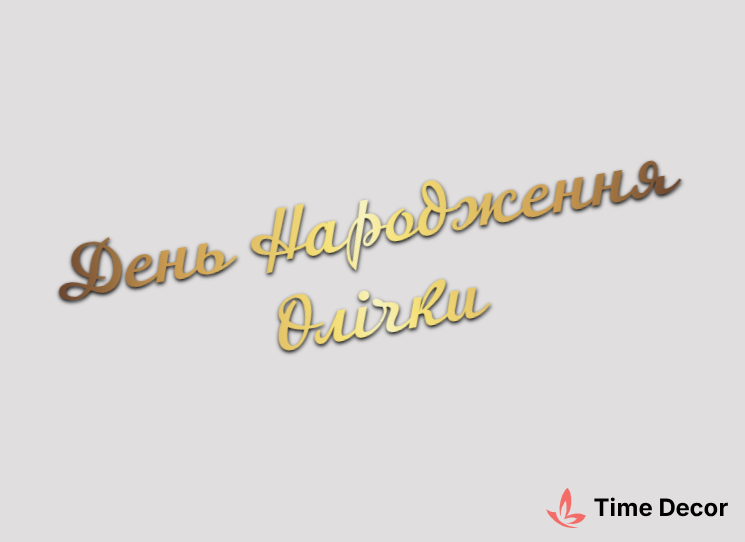 Пластиковий напис "День Народження Олічки" – дзеркальний або матовий пластик, можливе виготовлення з клейкою зворотною поверхнею для легкого монтажу.