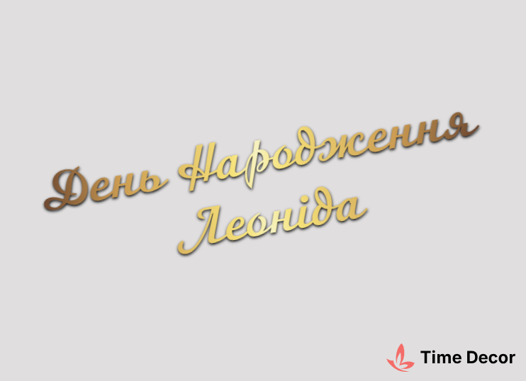 Пластиковий напис "День Народження Леоніда" – дзеркальний або матовий пластик, можливе виготовлення з клейкою зворотною поверхнею для легкого монтажу.