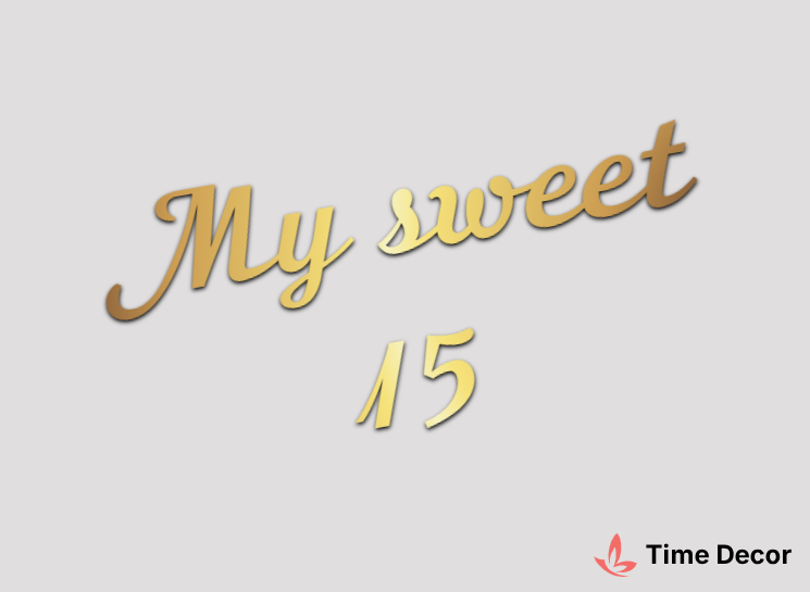 Пластиковий напис "Му sweet 15" – дзеркальний або матовий пластик, можливе виготовлення з клейкою зворотною поверхнею для легкого монтажу.