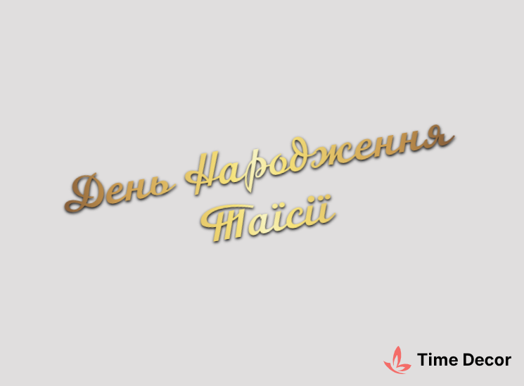 Пластиковий напис "День Народження Таїсії" – дзеркальний або матовий пластик, можливе виготовлення з клейкою зворотною поверхнею для легкого монтажу.