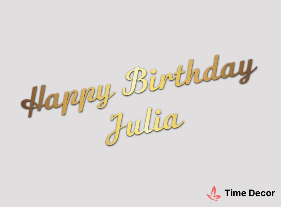 Пластиковий напис "Happy Birthday Julia" – дзеркальний або матовий пластик, можливе виготовлення з клейкою зворотною поверхнею для легкого монтажу.
