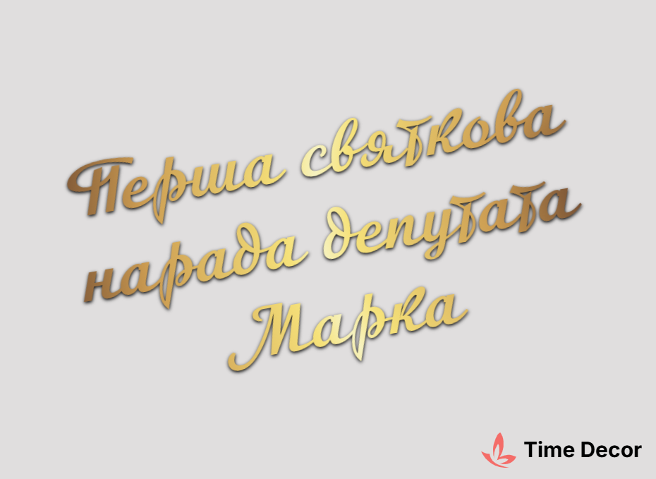 Пластиковий напис "Перша святкова нарада депутата Марка" – дзеркальний або матовий пластик, можливе виготовлення з клейкою зворотною поверхнею для легкого монтажу.