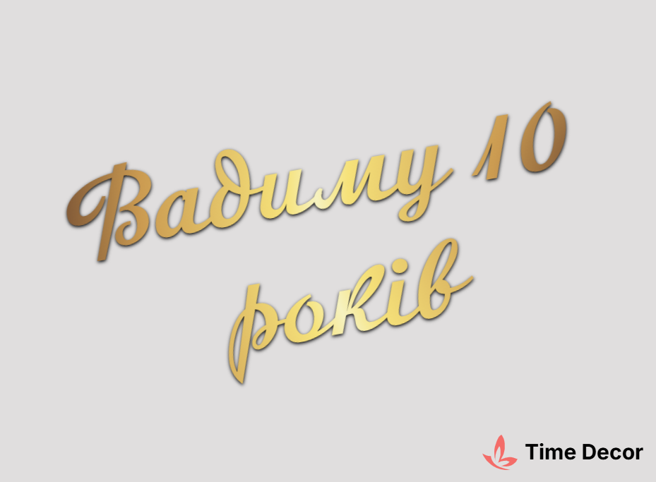 Пластиковий напис "Вадиму 10 років" – дзеркальний або матовий пластик, можливе виготовлення з клейкою зворотною поверхнею для легкого монтажу.