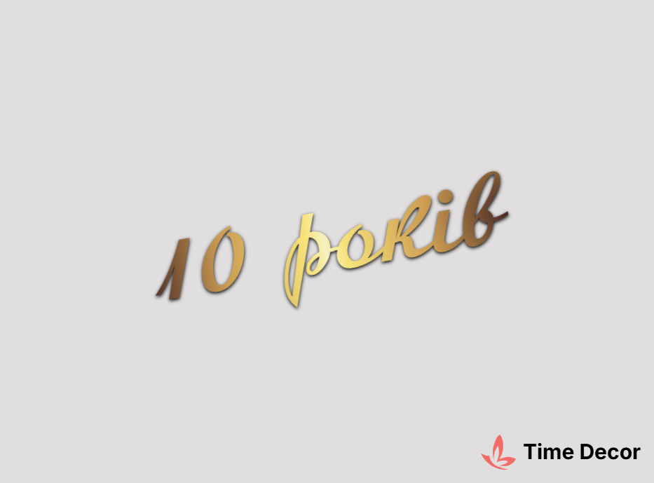 Пластиковий напис "10 років" – дзеркальний або матовий пластик, можливе виготовлення з клейкою зворотною поверхнею для легкого монтажу.