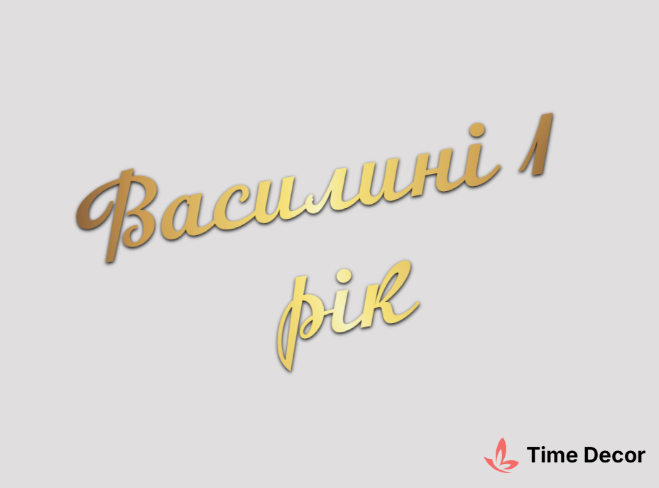 Пластиковий напис "Василині 1 рік" – дзеркальний або матовий пластик, можливе виготовлення з клейкою зворотною поверхнею для легкого монтажу.