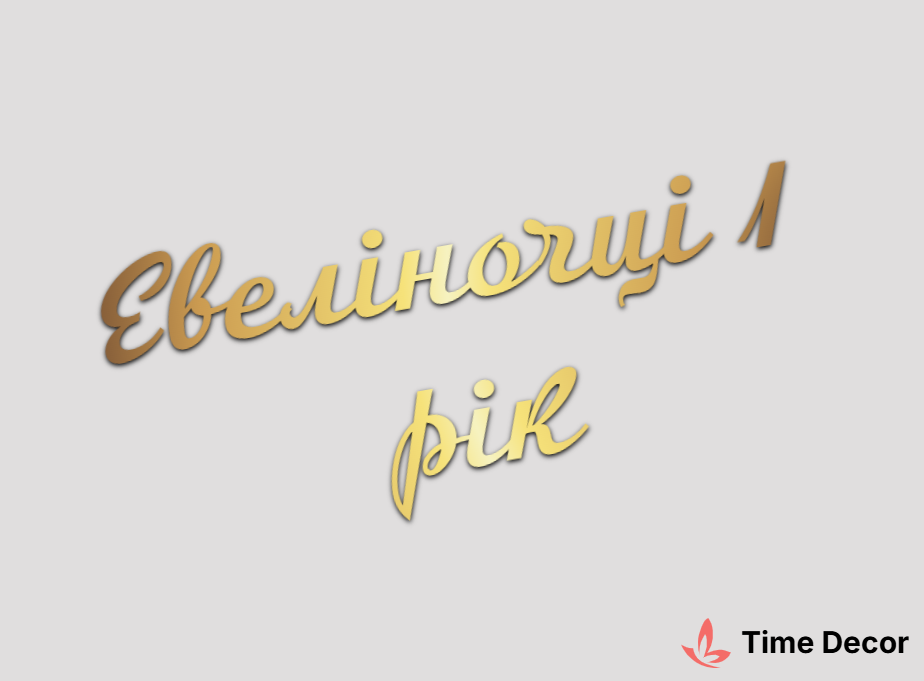 Пластиковий напис "Евеліночці 1 рік" – дзеркальний або матовий пластик, можливе виготовлення з клейкою зворотною поверхнею для легкого монтажу.