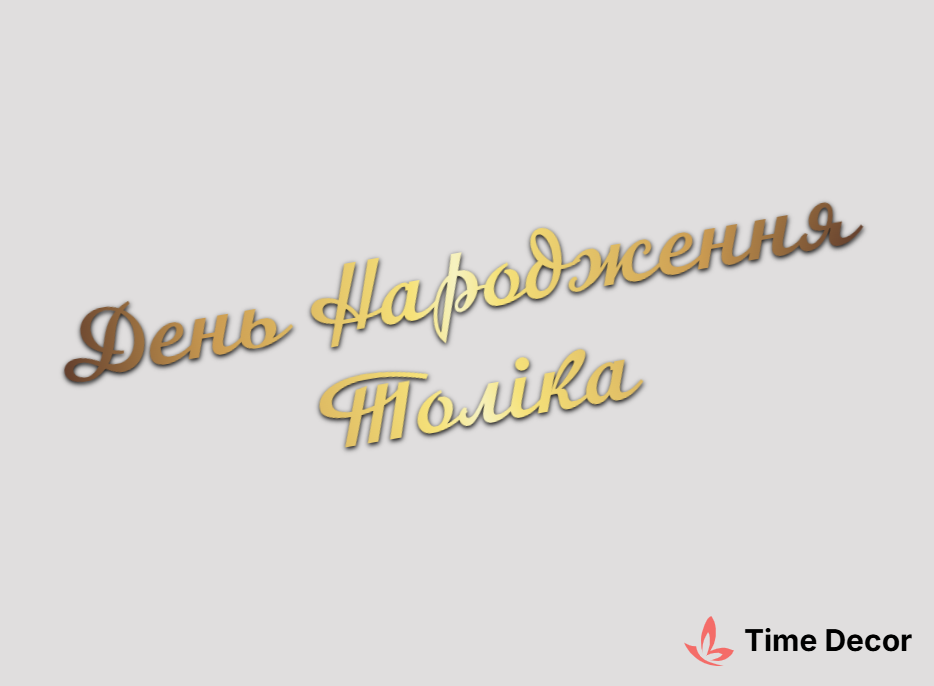 Пластиковий напис "День Народження Толіка" – дзеркальний або матовий пластик, можливе виготовлення з клейкою зворотною поверхнею для легкого монтажу.