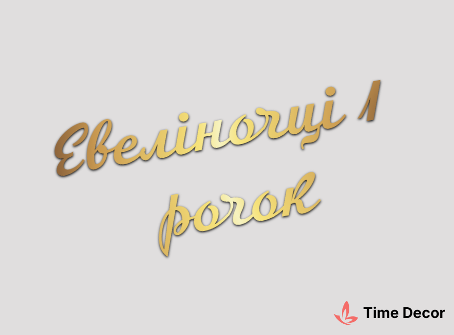 Пластиковий напис "Евеліночці 1 рочок" – дзеркальний або матовий пластик, можливе виготовлення з клейкою зворотною поверхнею для легкого монтажу.