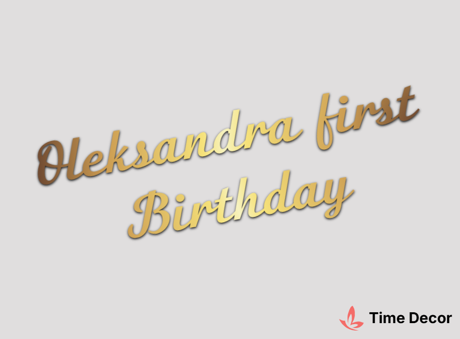 Пластиковий напис "Oleksandra first Birthday" – дзеркальний або матовий пластик, можливе виготовлення з клейкою зворотною поверхнею для легкого монтажу.