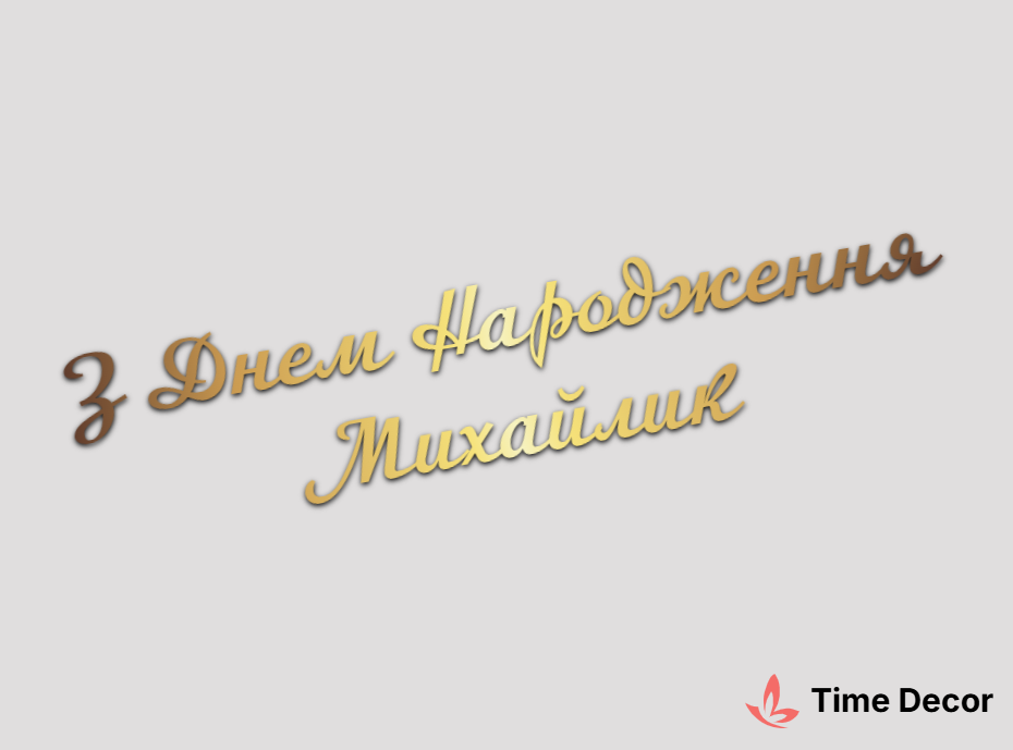 Пластиковий напис "З Днем Народження Михайлик" – дзеркальний або матовий пластик, можливе виготовлення з клейкою зворотною поверхнею для легкого монтажу.
