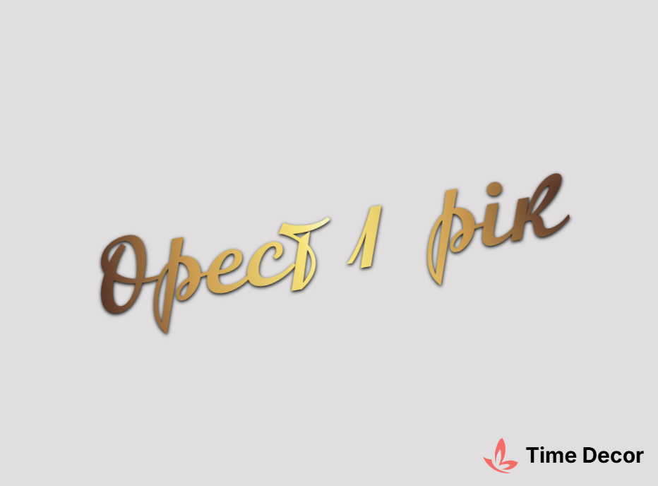Пластиковий напис "Орест 1 рік" – дзеркальний або матовий пластик, можливе виготовлення з клейкою зворотною поверхнею для легкого монтажу.