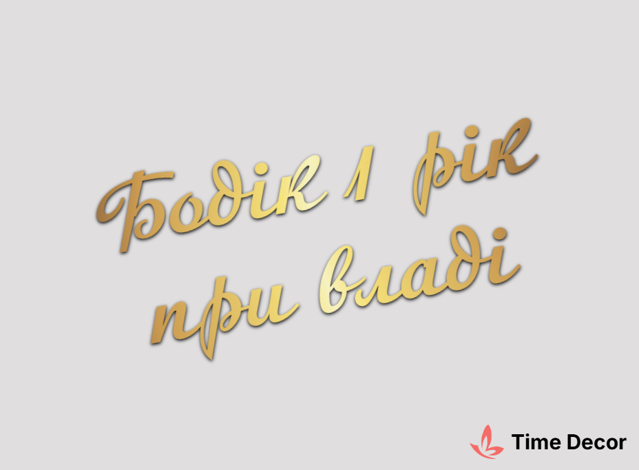 Пластиковий напис "Бодік 1 рік при владі" – дзеркальний або матовий пластик, можливе виготовлення з клейкою зворотною поверхнею для легкого монтажу.