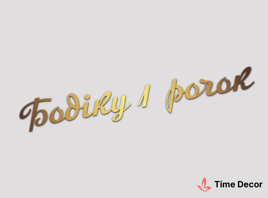 Пластиковий напис "Бодіку 1 рочок" – дзеркальний або матовий пластик, можливе виготовлення з клейкою зворотною поверхнею для легкого монтажу.