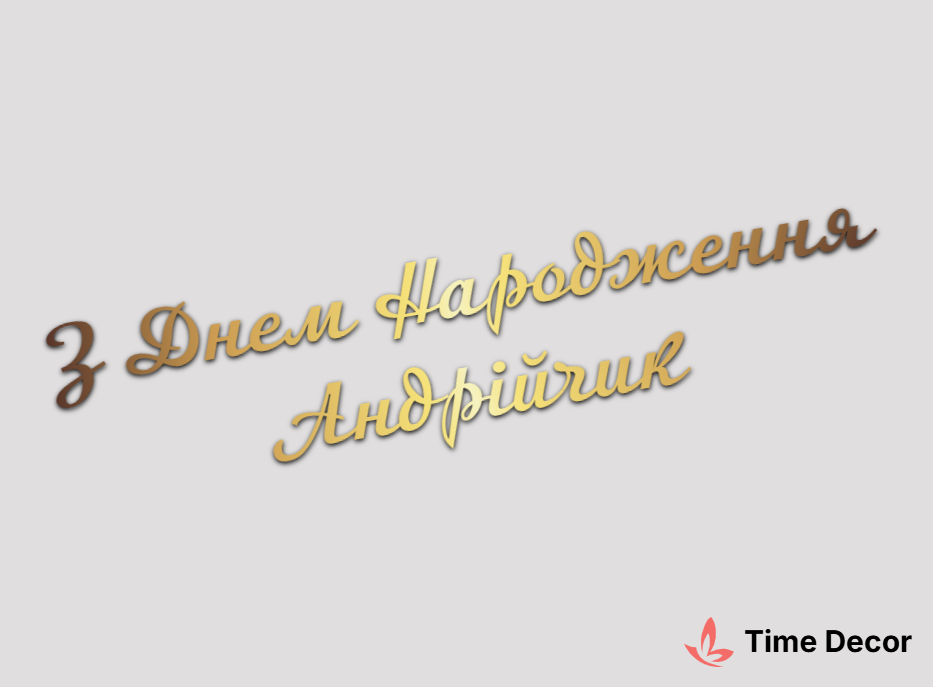 Пластиковий напис "З Днем Народження Андрійчик" – дзеркальний або матовий пластик, можливе виготовлення з клейкою зворотною поверхнею для легкого монтажу.