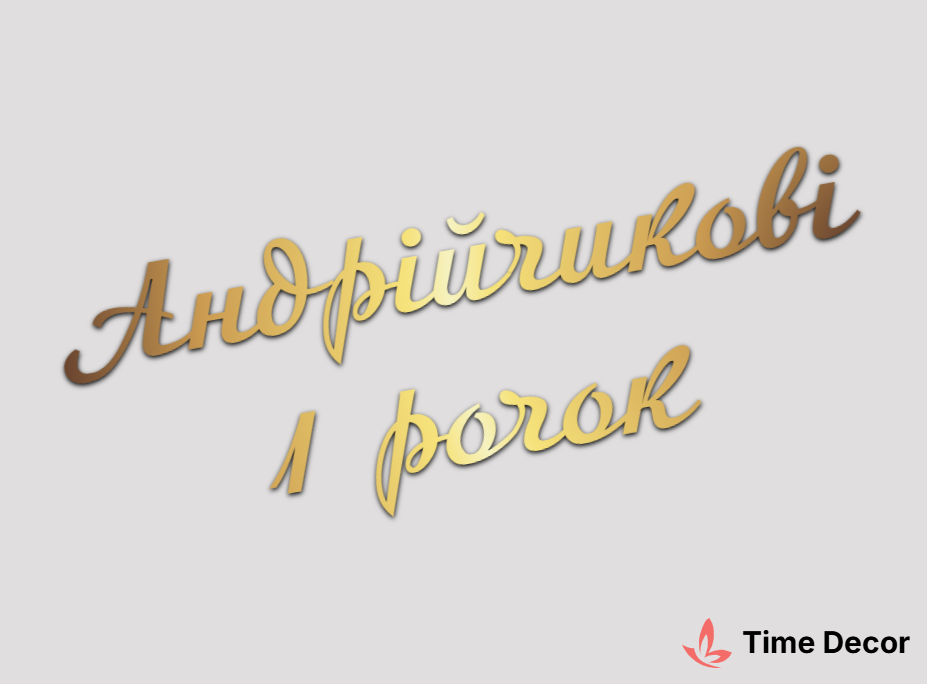 Пластиковий напис "Андрійчикові 1 рочок" – дзеркальний або матовий пластик, можливе виготовлення з клейкою зворотною поверхнею для легкого монтажу.