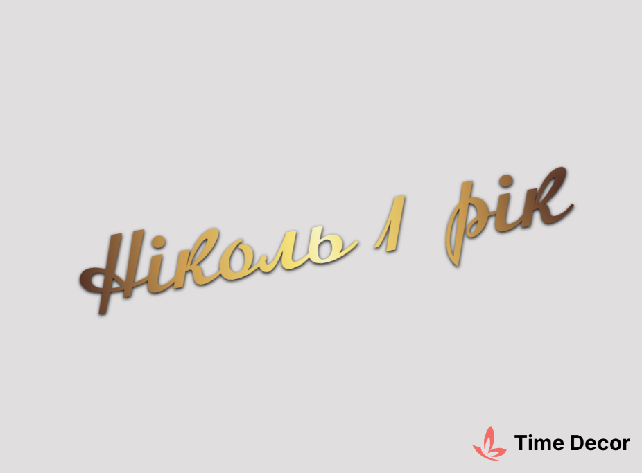 Пластиковий напис "Ніколь 1 рік" – дзеркальний або матовий пластик, можливе виготовлення з клейкою зворотною поверхнею для легкого монтажу.