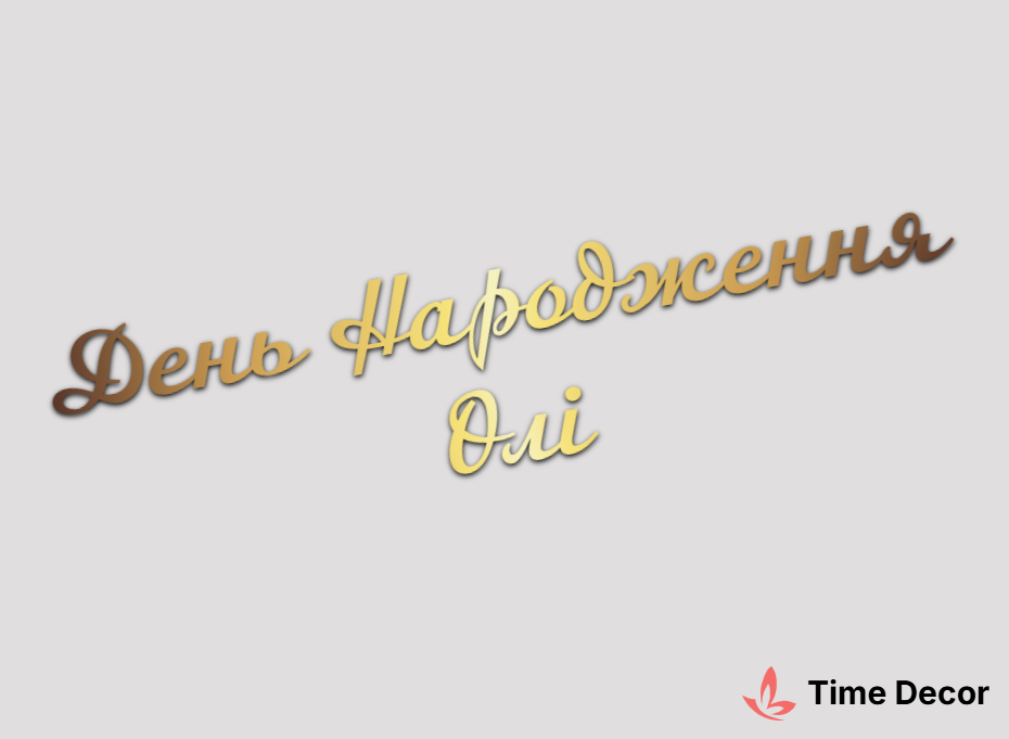 Пластиковий напис "День Народження Олі" – дзеркальний або матовий пластик, можливе виготовлення з клейкою зворотною поверхнею для легкого монтажу.