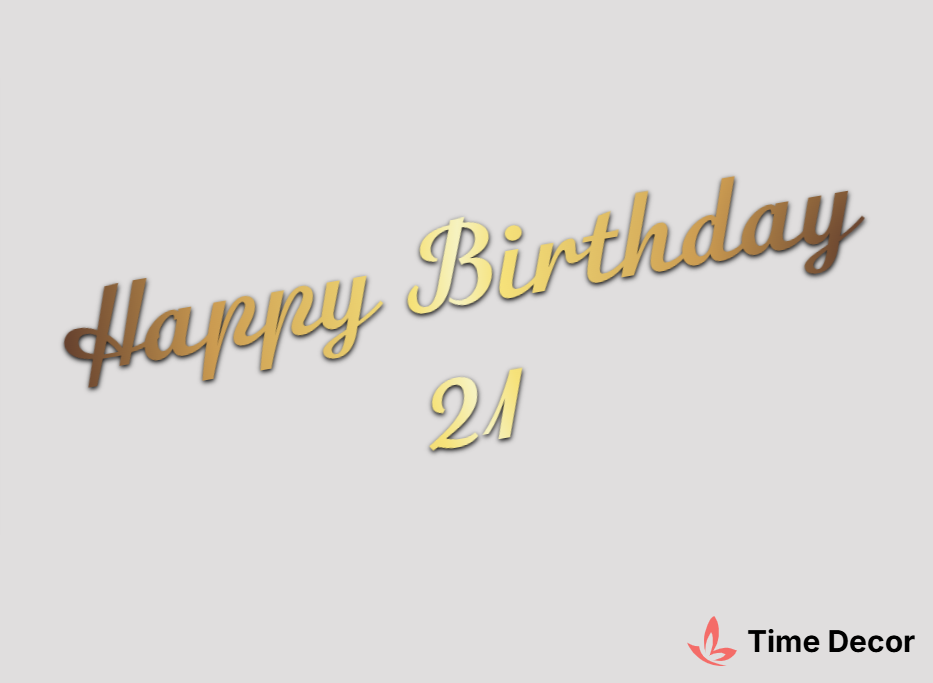 Пластиковий напис "Happy Birthday 21" – дзеркальний або матовий пластик, можливе виготовлення з клейкою зворотною поверхнею для легкого монтажу.