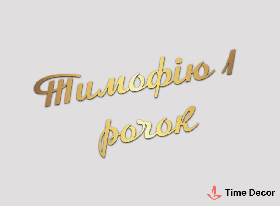 Пластиковий напис "Тимофію 1 рочок" – дзеркальний або матовий пластик, можливе виготовлення з клейкою зворотною поверхнею для легкого монтажу.