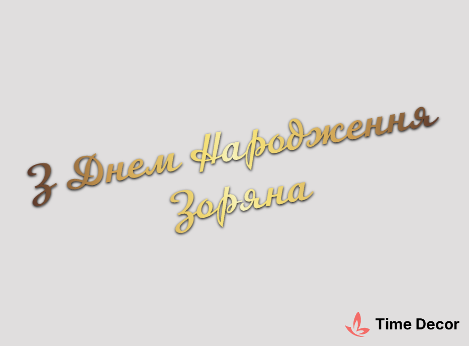 Пластиковий напис "З Днем Народження Зоряна" – дзеркальний або матовий пластик, можливе виготовлення з клейкою зворотною поверхнею для легкого монтажу.