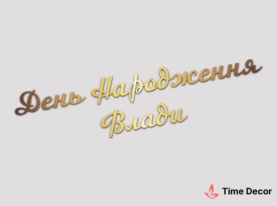 Пластиковий напис "День Народження Влади" – дзеркальний або матовий пластик, можливе виготовлення з клейкою зворотною поверхнею для легкого монтажу.