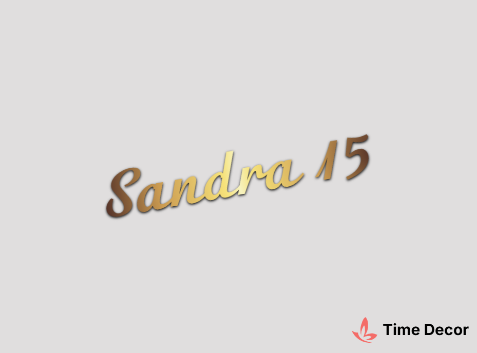 Пластиковий напис "Sandra 15" – дзеркальний або матовий пластик, можливе виготовлення з клейкою зворотною поверхнею для легкого монтажу.