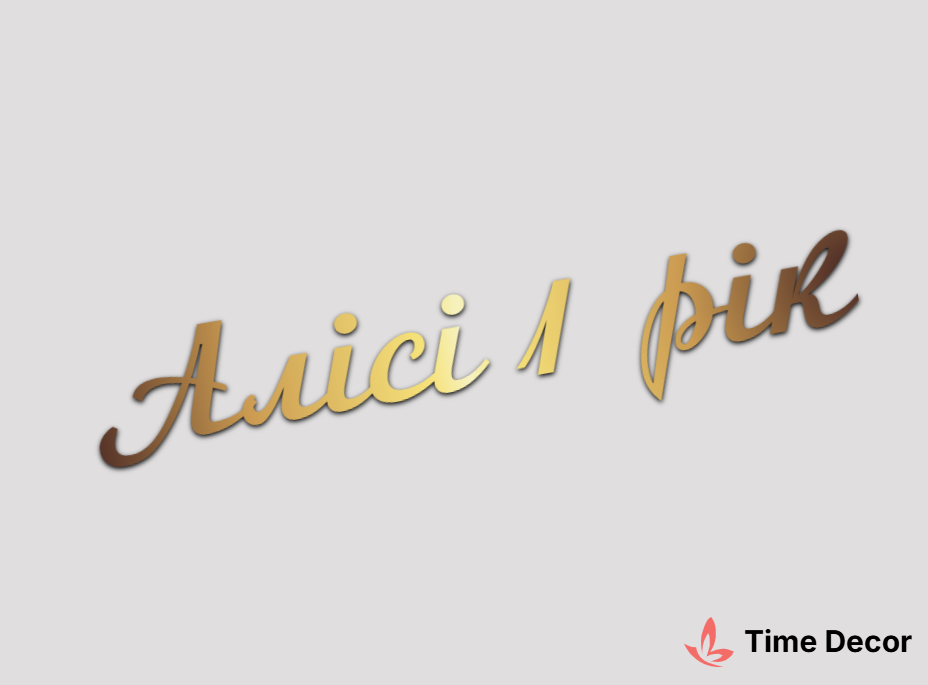 Пластиковий напис "Алісі 1 рік" – дзеркальний або матовий пластик, можливе виготовлення з клейкою зворотною поверхнею для легкого монтажу.