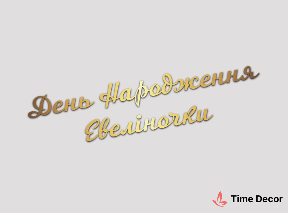 Пластиковий напис "День Народження Евеліночки" – дзеркальний або матовий пластик, можливе виготовлення з клейкою зворотною поверхнею для легкого монтажу.