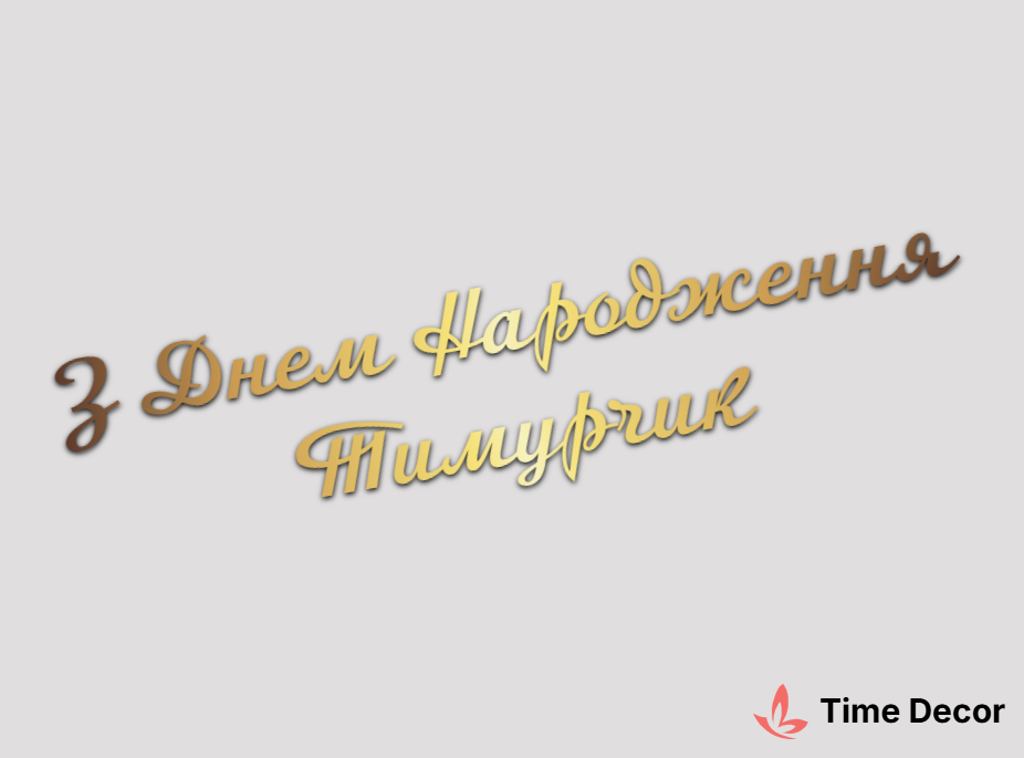 Пластиковий напис "З Днем Народження Тимурчик" – дзеркальний або матовий пластик, можливе виготовлення з клейкою зворотною поверхнею для легкого монтажу.